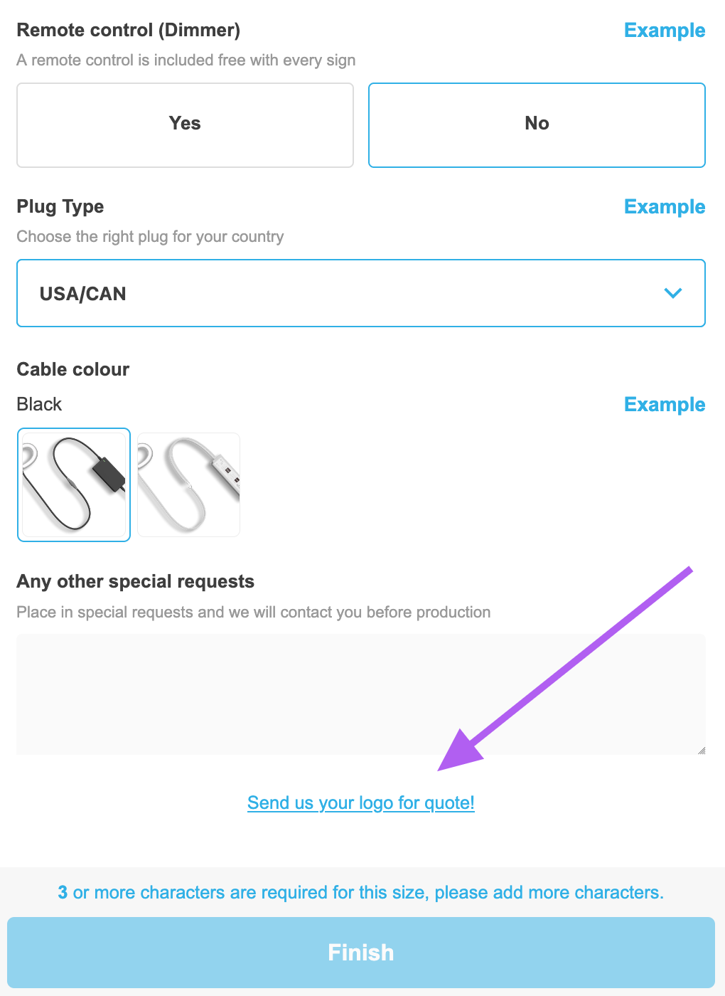 Instead of embedding a custom form within the customiser, you can add a link to an external page. This link will be placed at the top of the selections column in your customiser.