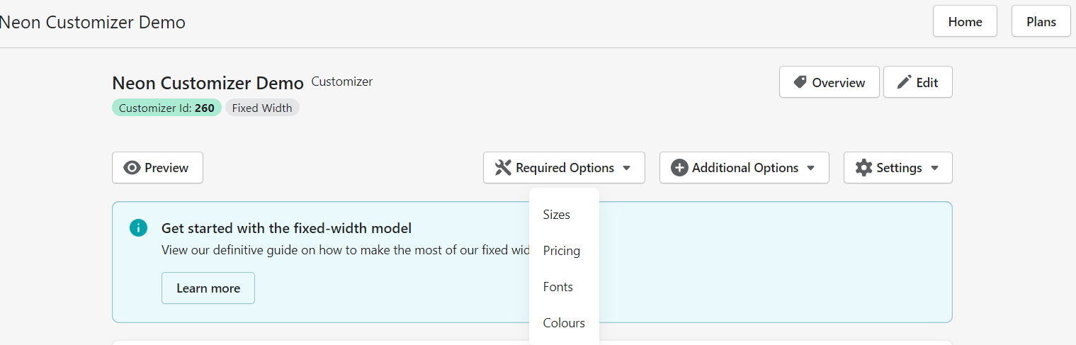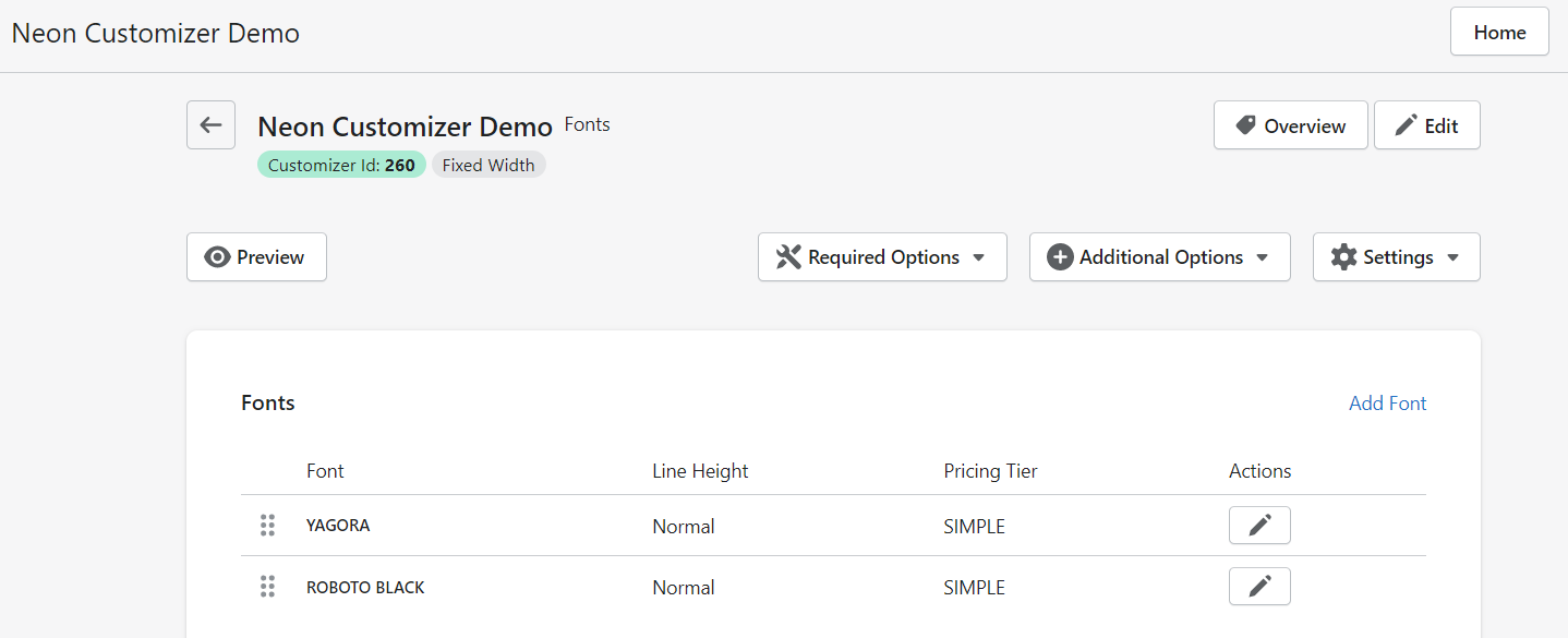 2. On the Customiser Page, click the Required Options button with the tool icon and click Fonts: