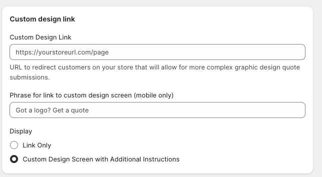 Scroll down to the “Custom design link” card and make sure “Custom design screen with additional instructions” is checked.