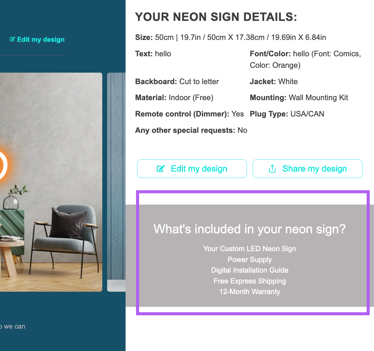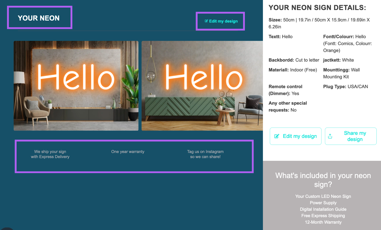 The review screen allows users to view the final sign design and details before adding it to the cart. You can customise or translate this text into the desired language.