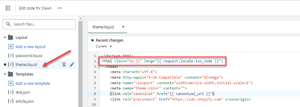 Edit Your Theme Code by navigating to Sales Channels > Online Store > Themes in your Shopify dashboard.