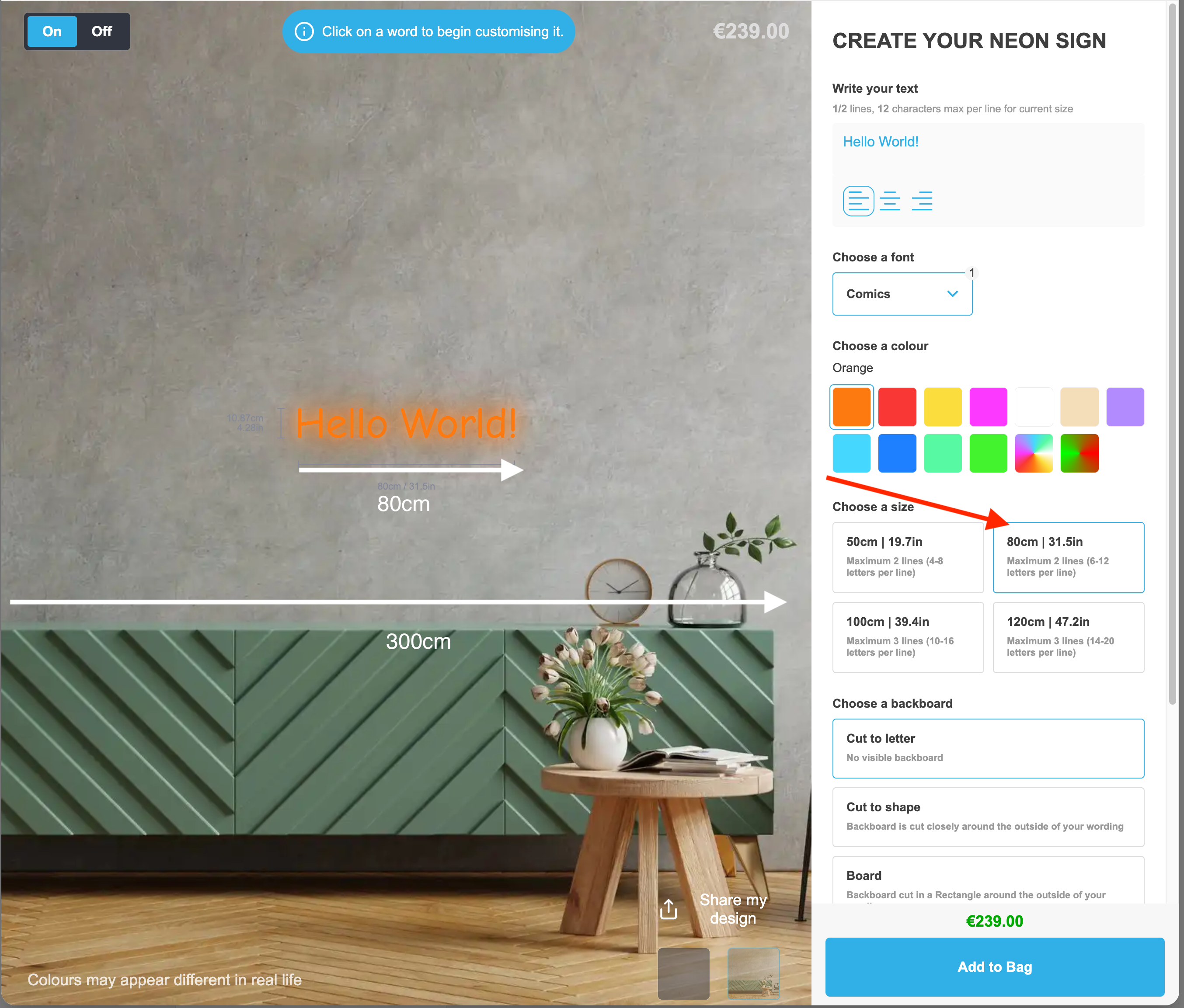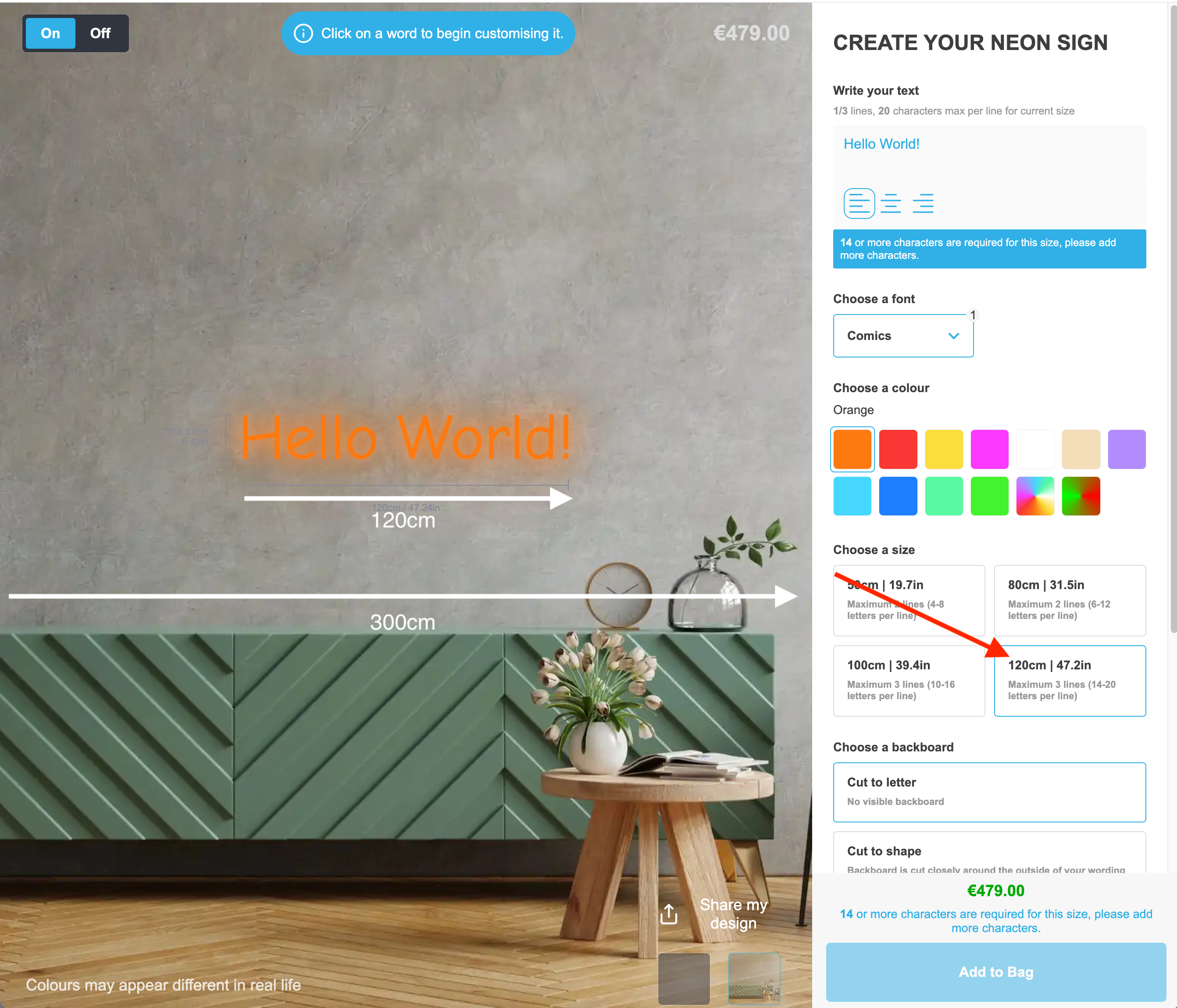 When you specify a width and height (in centimetres) for your background image, the visualiser will scale the customers sign to the dimensions of the selected background.