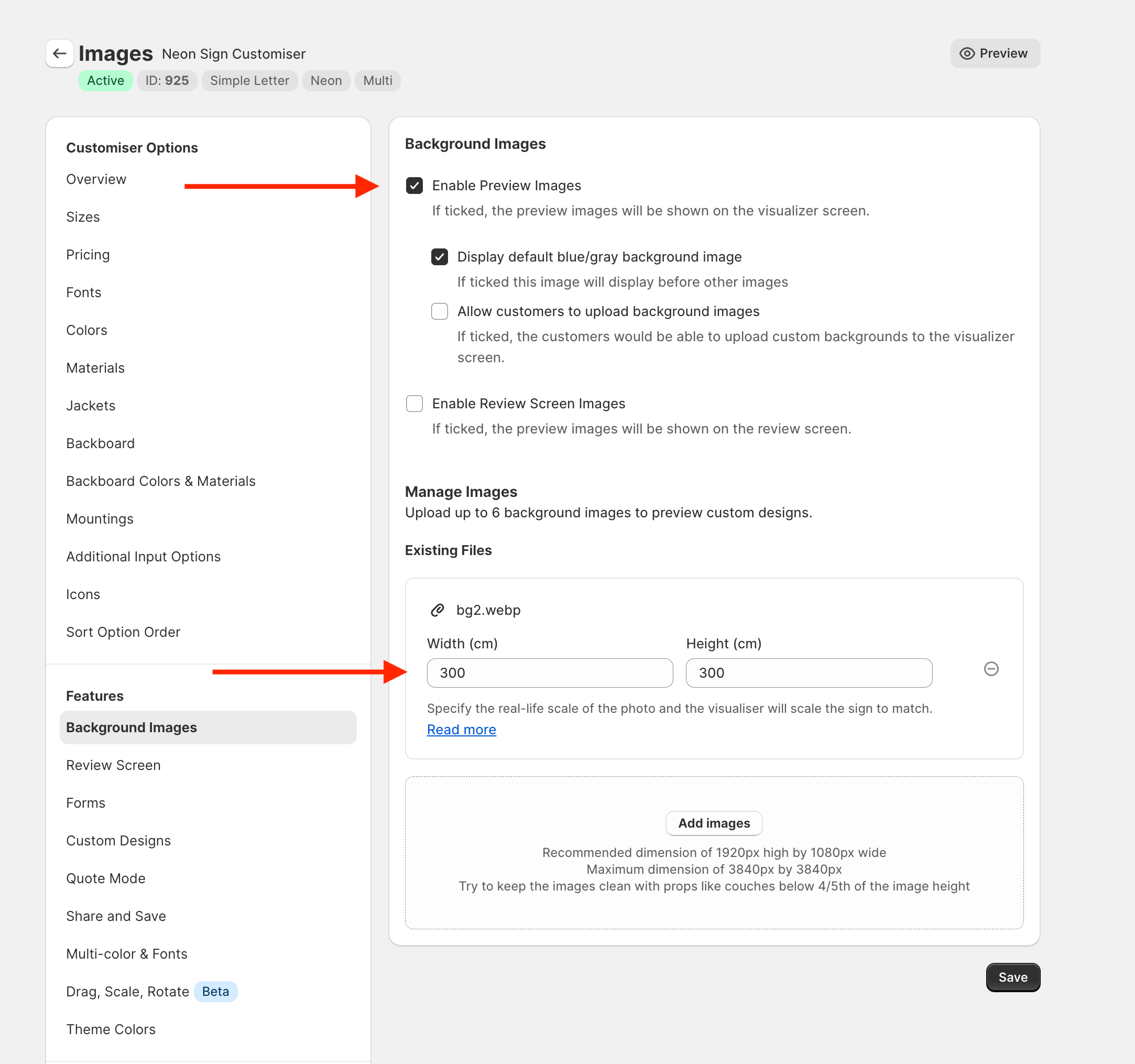To enable this, ensure you have “Preview Images” checked, which will enable the width and height input for the images you have already uploaded.