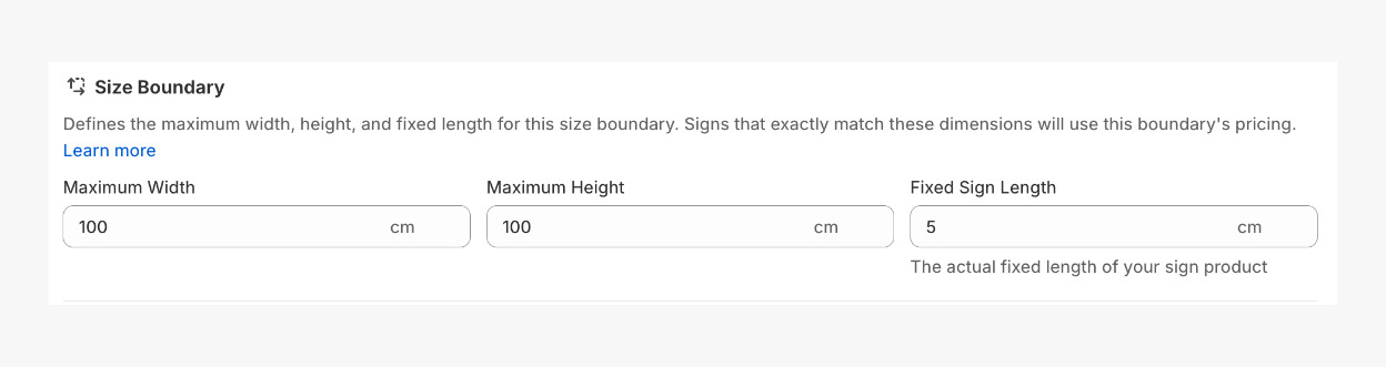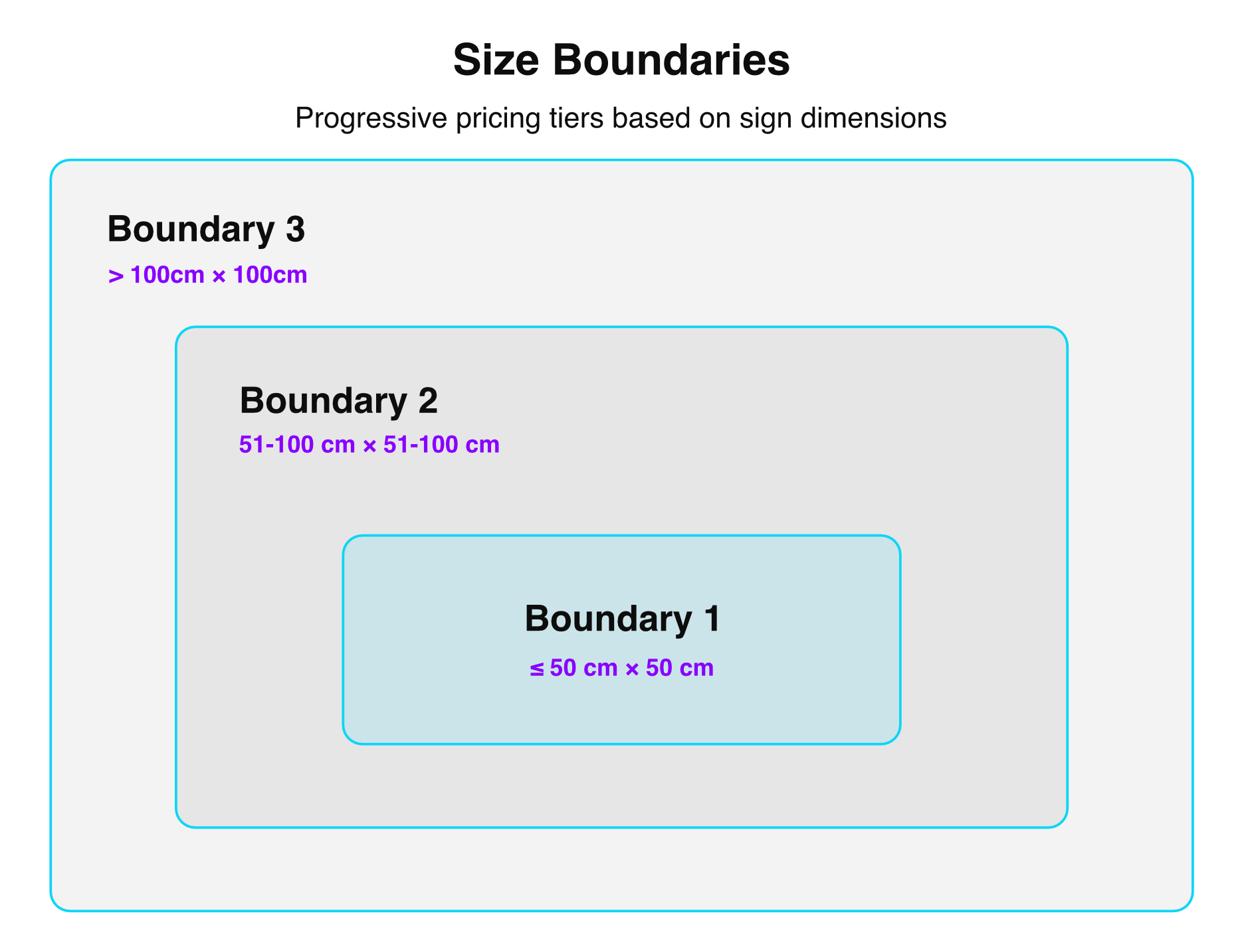 Size boundaries are pricing tiers based on sign dimensions. They allow you to adjust pricing as the sign size increases.