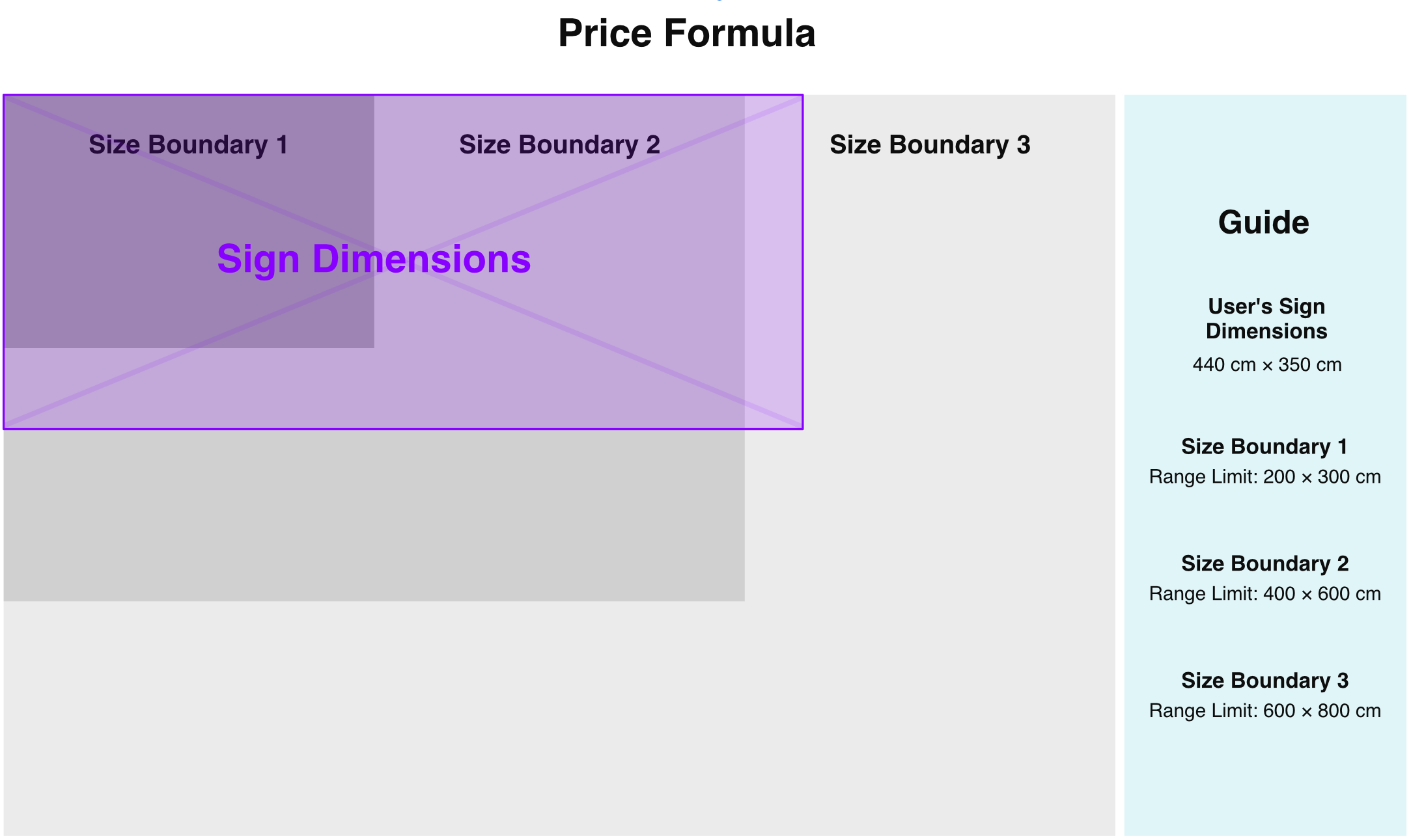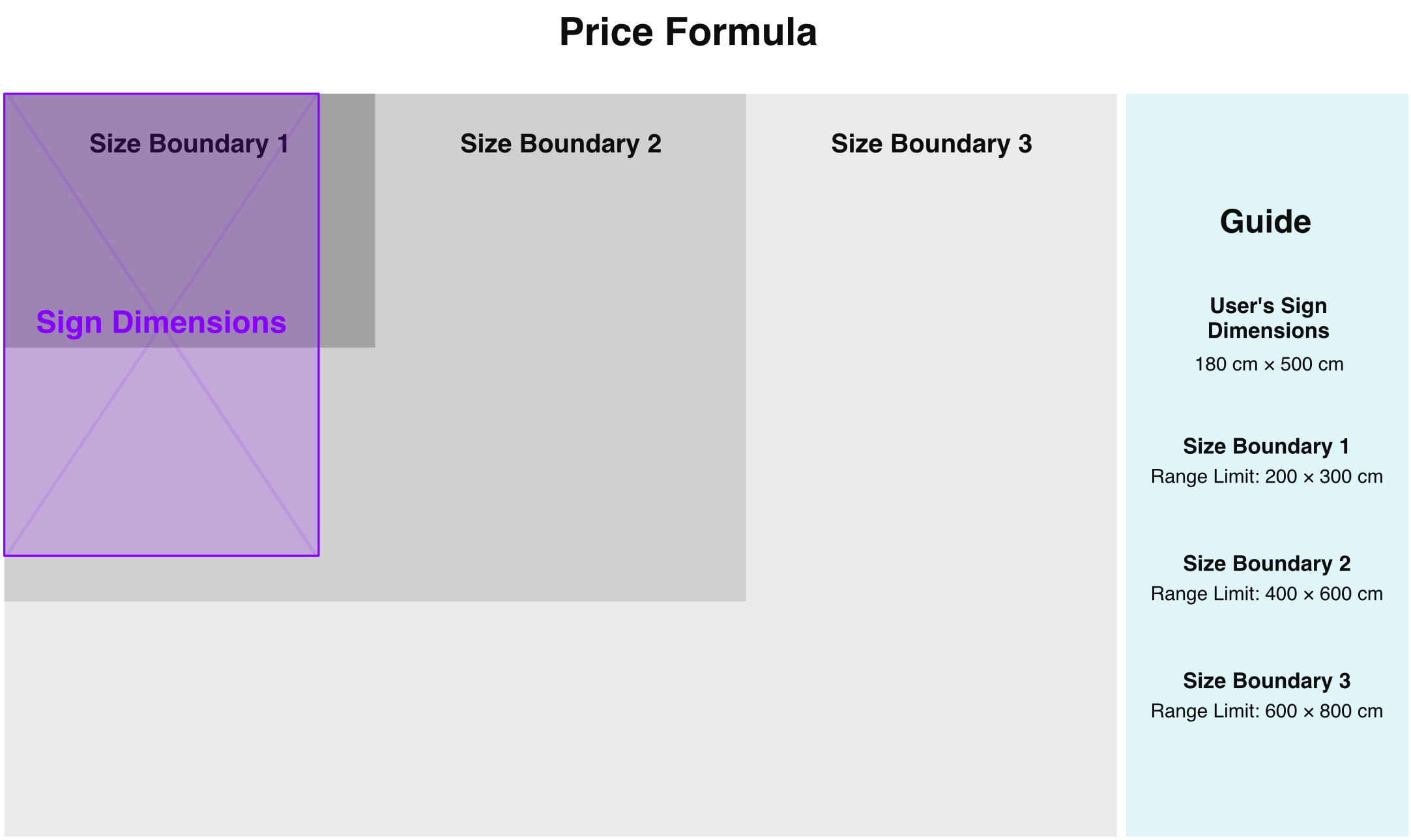 In the example below, the sign’s width falls within Size Boundary 1, but because the sign’s height exceeds Size Boundary 1, Size Boundary 2’s pricing (material, shipping, base price, etc.) is used.