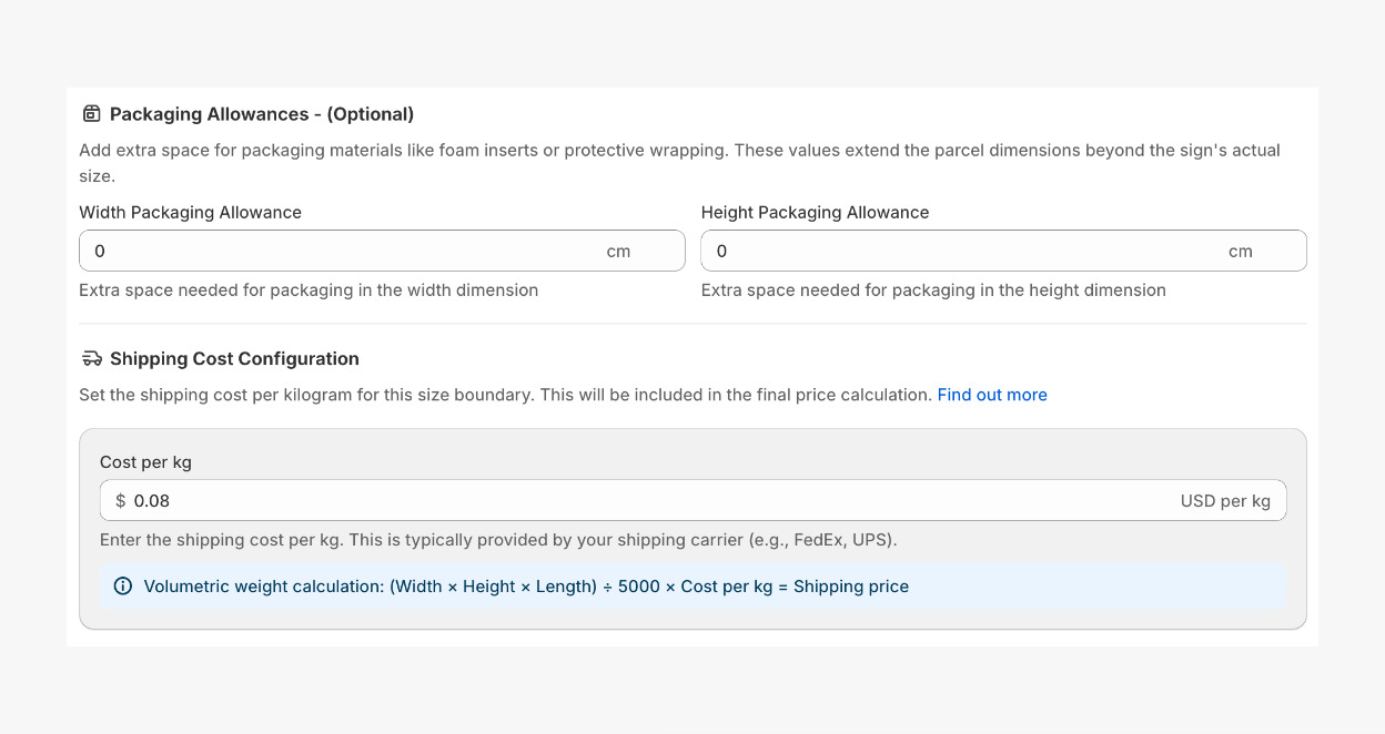 Select CM³ - Volumetric Parcel (see Step 3: Configure Sign Dimension Pricing)