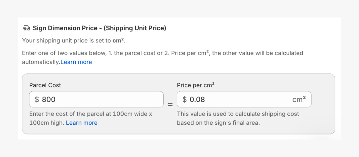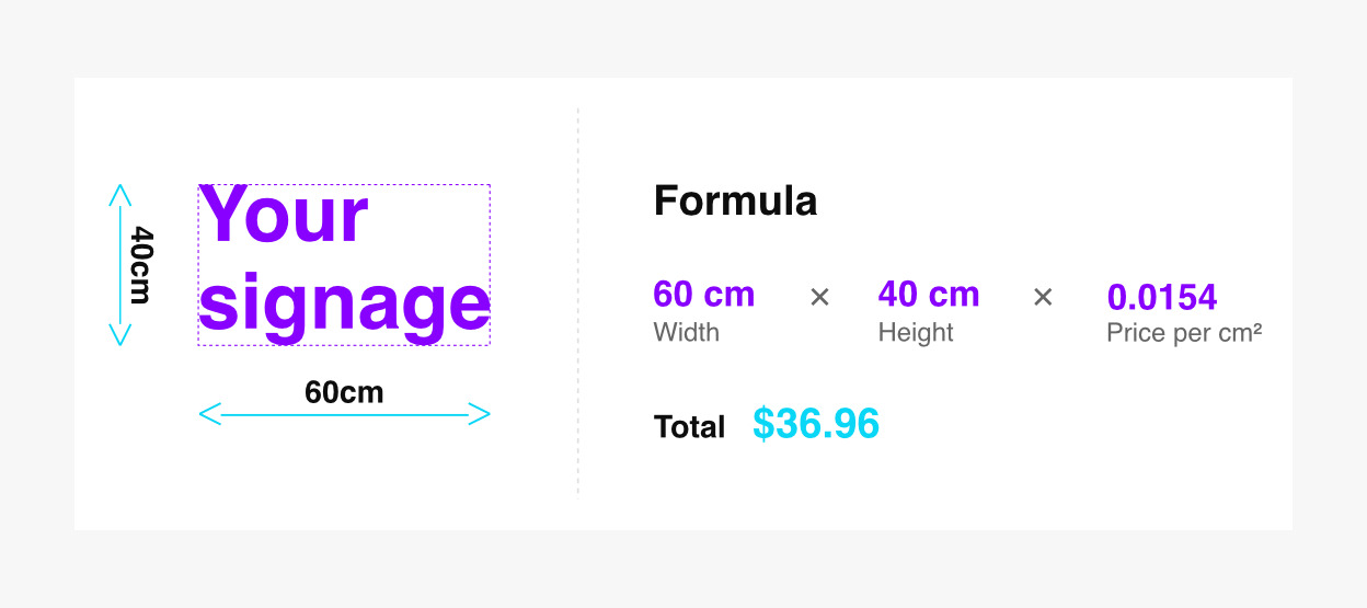 If a sign is 40 cm × 60 cm and your rate is 0.0154 per cm², the shipping cost is calculated using the total surface area.