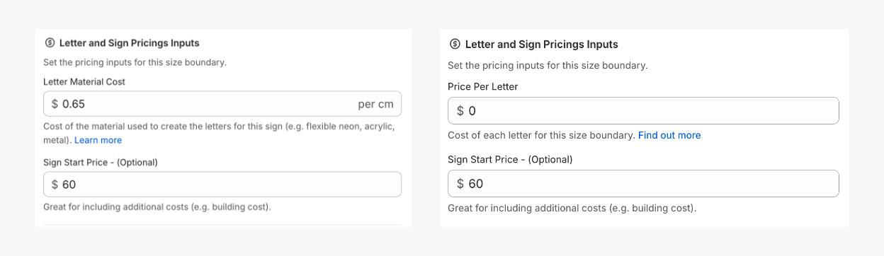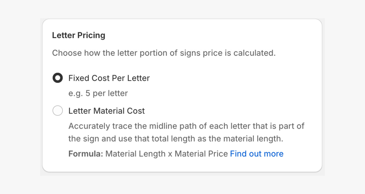Unlike fixed-size pricing, this model calculates costs based on the actual material length required to produce each letter. The system traces the precise outlines of every character and multiples them by your material rate, resulting in highly accurate pricing.