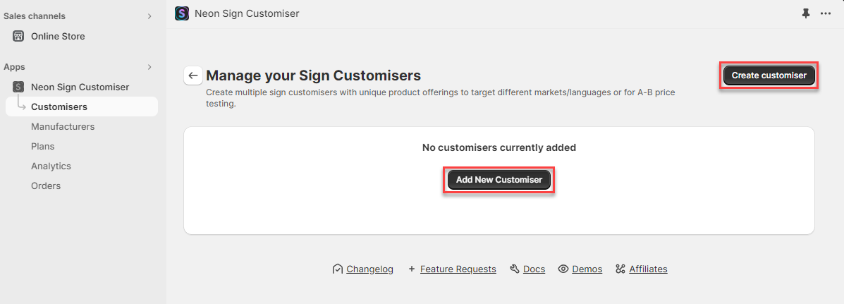 On the Customisers page, choose either Add New Customiser or Create Customiser.