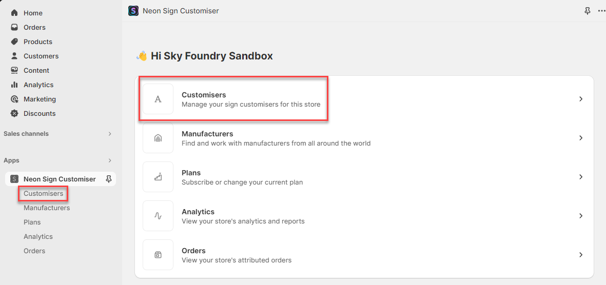 Once you have successfully installed the app, open it. You will be redirected to the homepage. From this page, select Customisers.