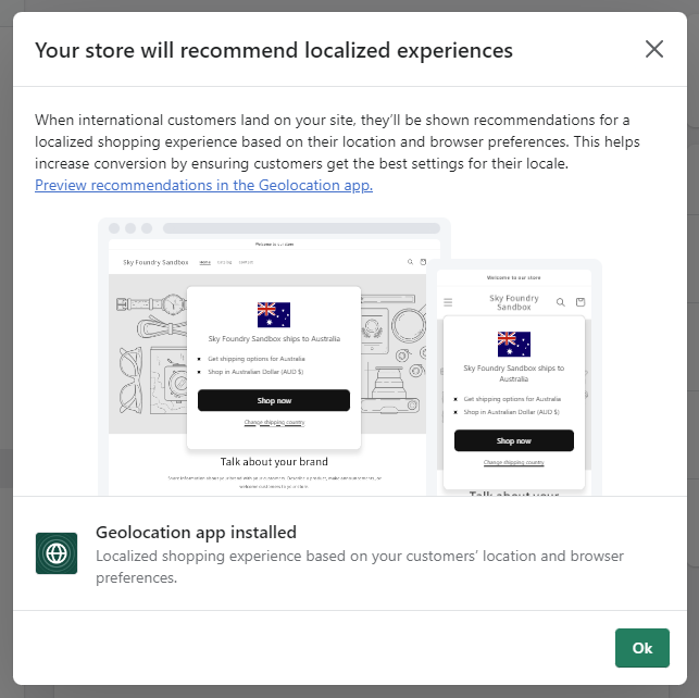 After finishing setting up your markets, go to the Geolocation app that was automatically installed when you added a new market. The Geolocation app allows you to display a recommendations pop-up and a currency selector.