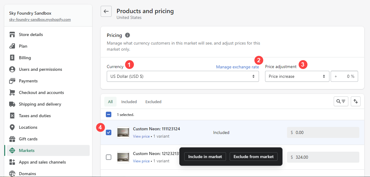 Include/Exclude products: You can choose to exclude some products from your new market.