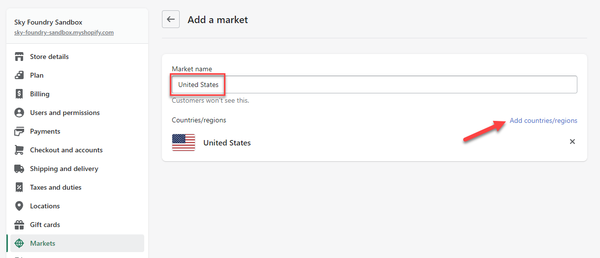 On the next page, select the new market’s country/region and give it a name. For example, you can create a new market named “United States” with the USD currency.