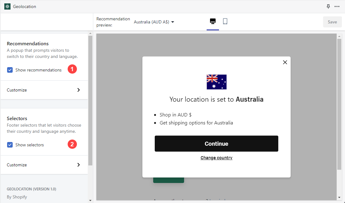 Show recommendations: This option will show a recommended pop-up based on your customer’s location. Customers can choose to either proceed with the recommended market or stick with your default market.