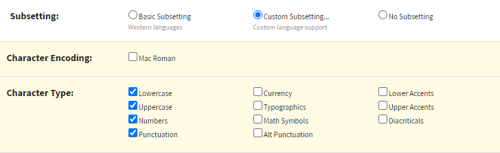 - Character Type: Lowercase, Uppercase, Numbers, Punctuation (You can choose additional character types, but note that this will increase the output font files.)