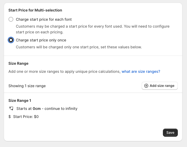 Scroll down to you see this section and ensure “Charge start price only once”. This section sizing options will display slightly different for fixed-width and fixed-height models.