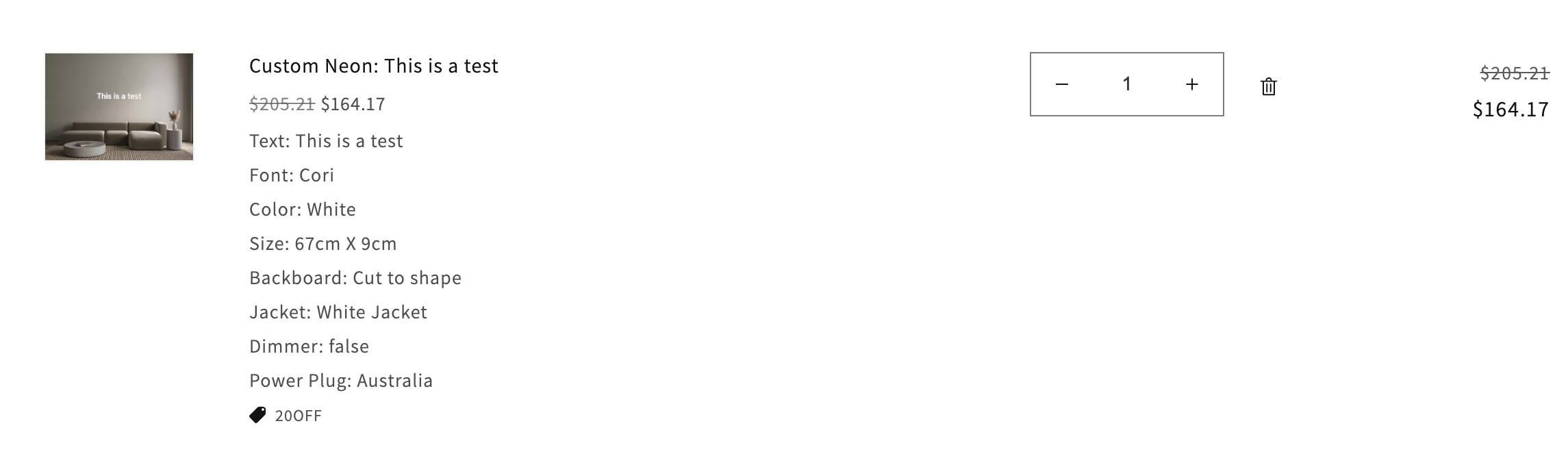 8. Test your new discount by going to the frontend of your store and adding a new custom neon product to your cart, you should see the automatic discount apply.