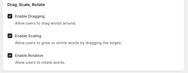 You can enable the settings to drag, scale, and rotate individually per customiser.