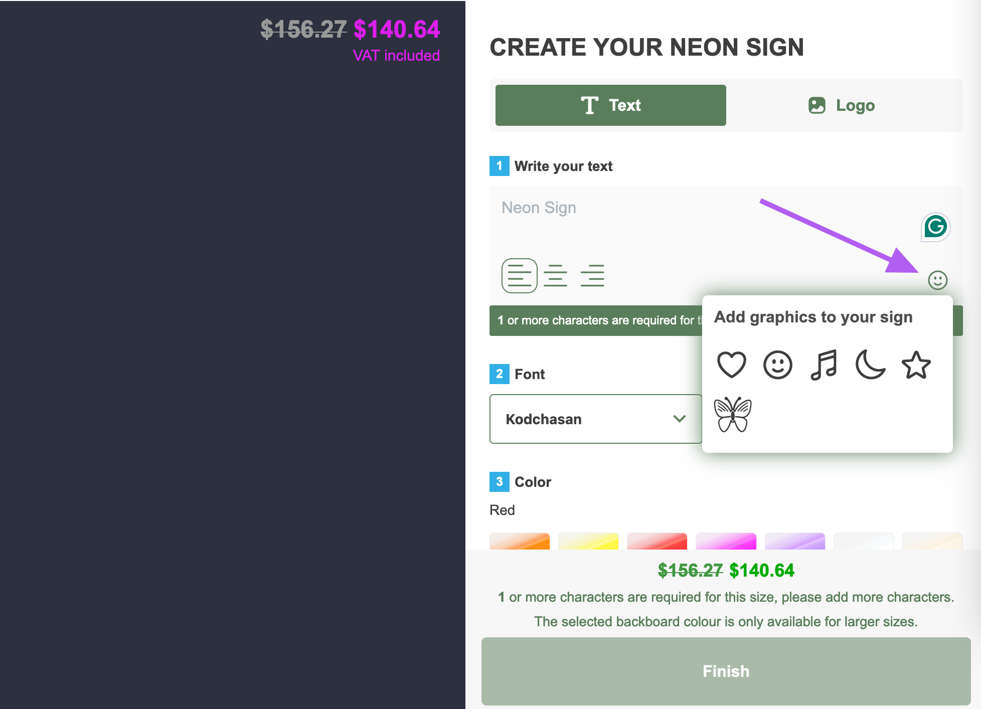 Customers can access your icons by clicking the smiling emoji icon located on the right-hand side of the text input field in your customiser. From there, they can browse and select icons to include in their custom sign designs.
