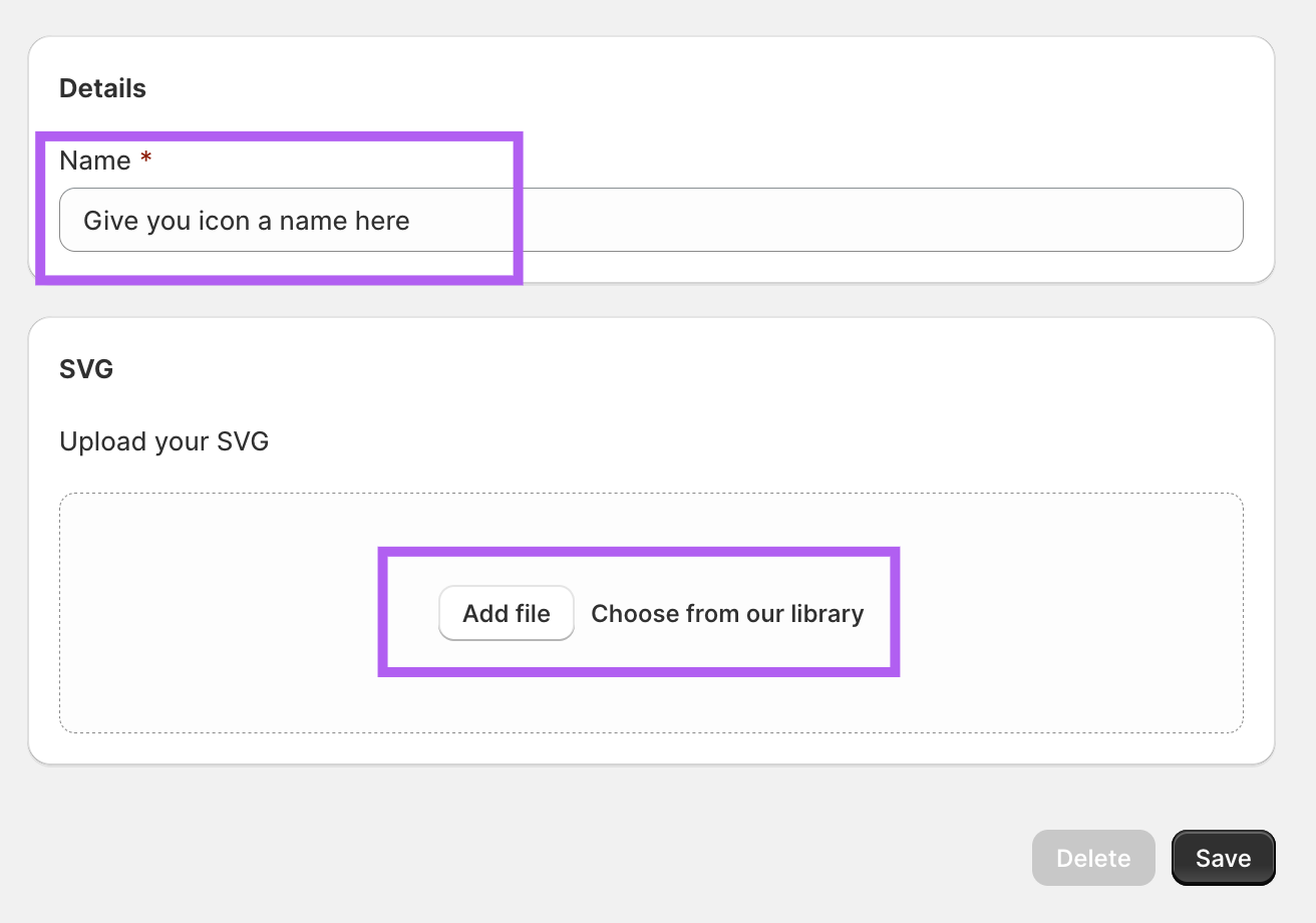 Give your icon a name and click on the ‘Add file’ button to select and upload SVG files from your computer. Alternatively, browse through our extensive in-app icon library and choose from a variety of icons available.
