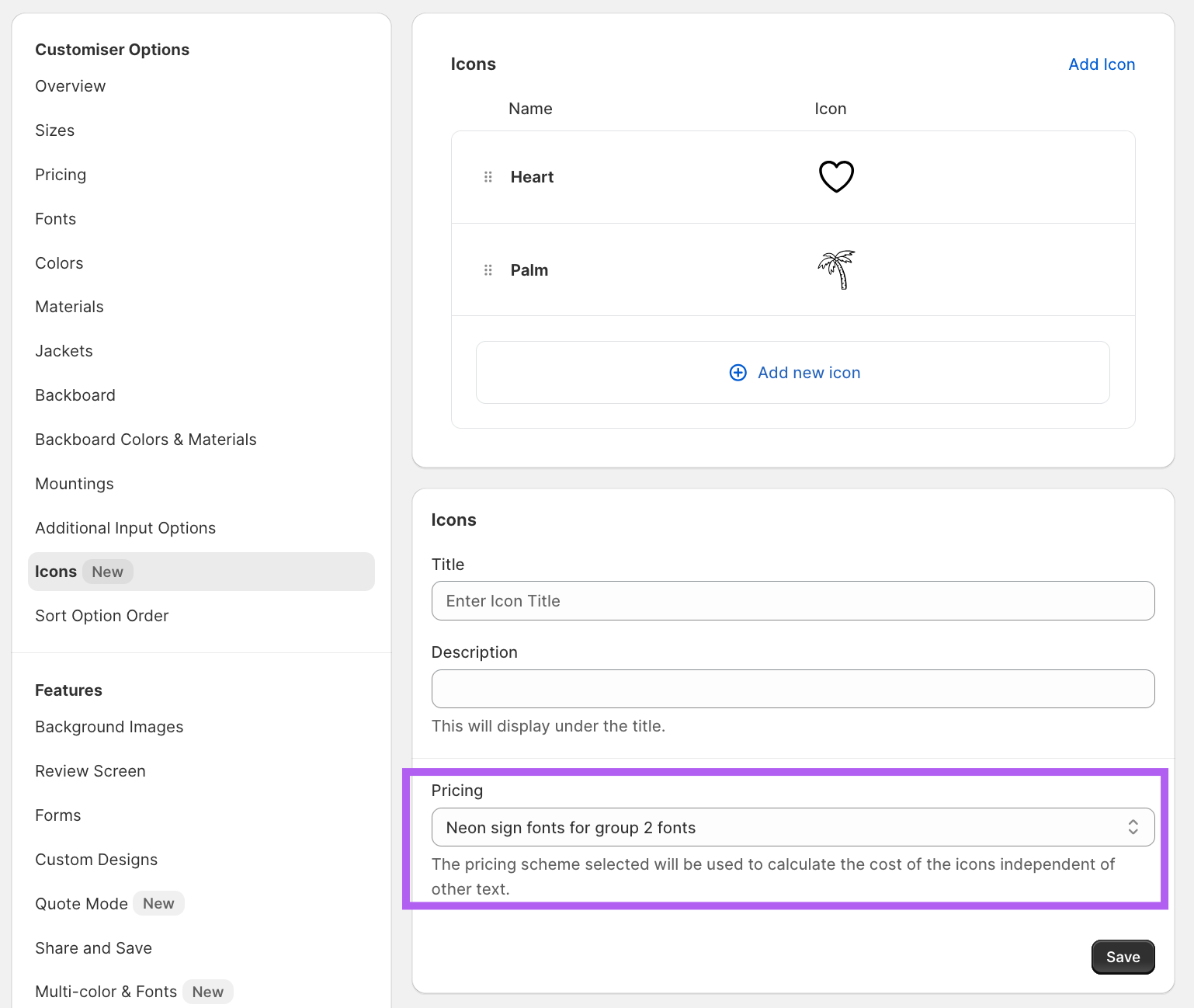 Assign a pricing model to your icons to ensure accurate cost calculations and click Save.