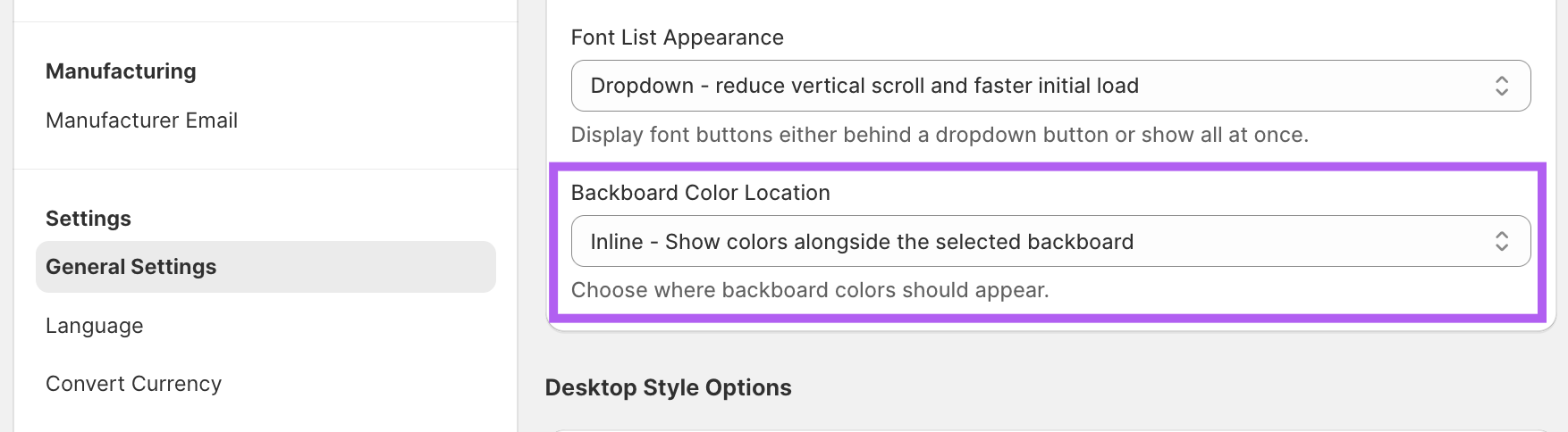 In the General Style Settings section, set the Backboard Colour Location option to “Inline - Show colours alongside the selected backboard” in the dropdown menu.
