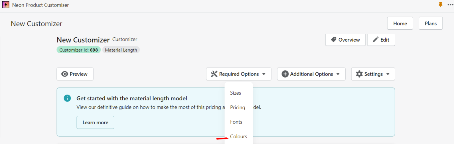 2. On the Customiser Page, click the Required Options button with the tool icon and click Colours: