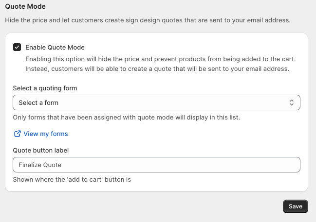 Before enabling quote mode on your customiser, you must have already created a form on your customiser with the setting “Quote mode.” selected.