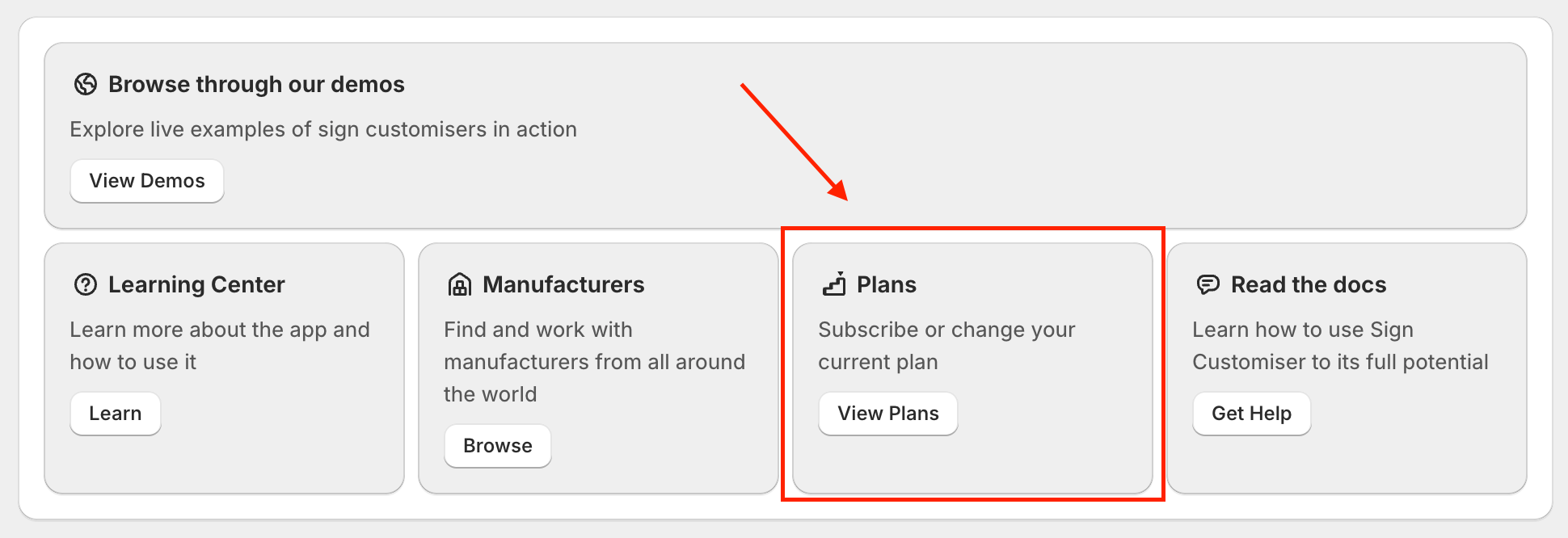 In the Sign customiser settings, click on Plans which is found in the homepage to view, upgrade, or cancel your subscription.