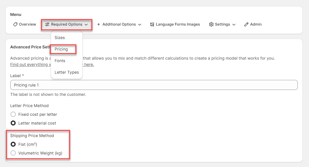 To set up Shipping Price, from your customiser editor page, negative to Required Options > Pricing and edit your pricing rules. On the pricing editor page, you will find the Shipping Price Method option. Choose either Flat or Volumetric Weight.