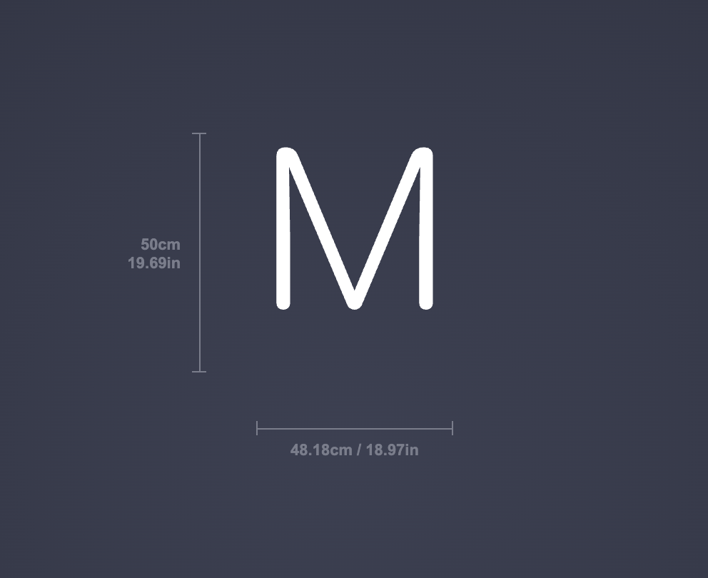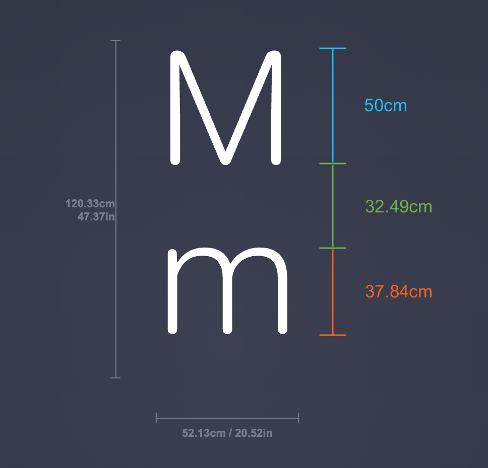 Here’s a visual example with the nominated height set to 50cm. The tallest line, the capital letter M, will take on this number. The smaller letter m is shorter than capital letter M, therefore it is only a fraction of the nominated height - 37.84cm. In a multiline scenario, all lines will naturally scale from the tallest line.