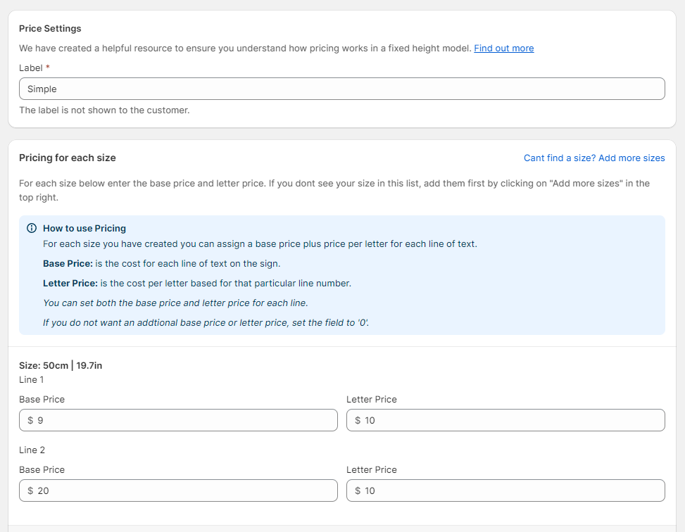 Base Price: this is the cost for each line of text on the neon sign. You can have different based prices for the first line, second line, third line, etc.