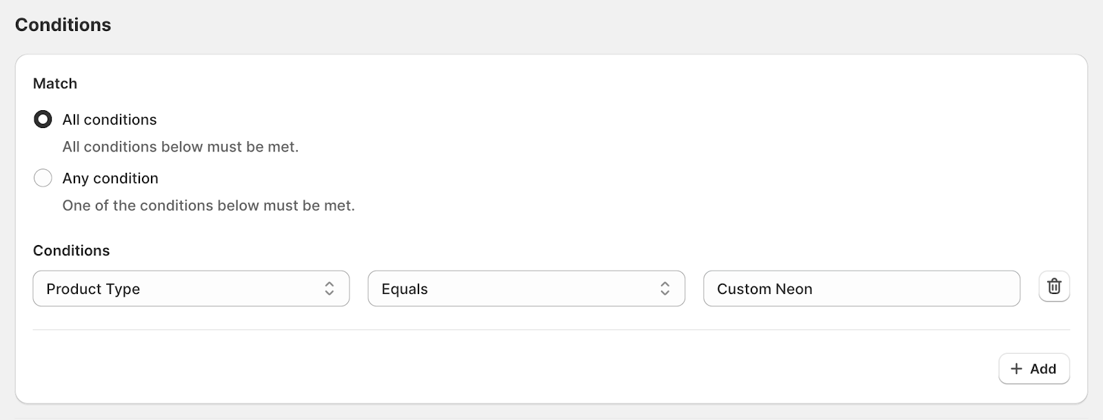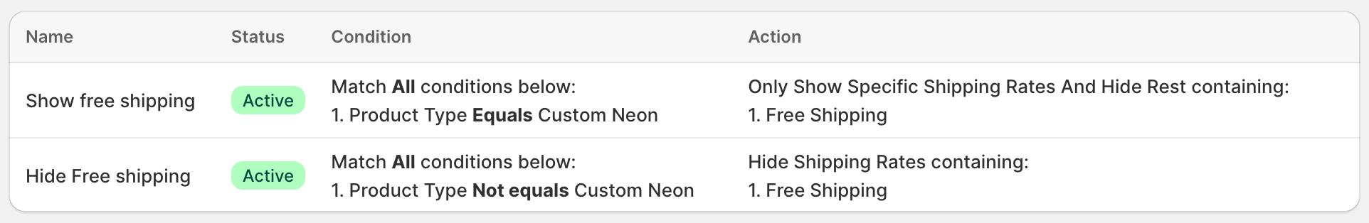 This setup ensures that free shipping is applied exclusively to custom neon signs while other products follow your standard shipping rates.