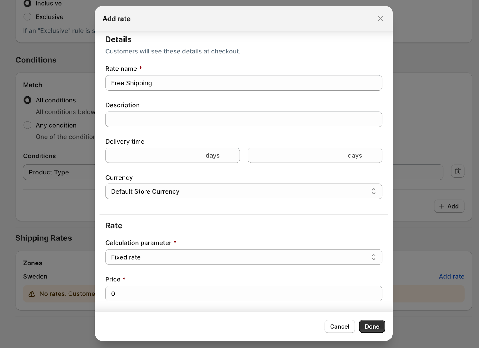 After setting up your shipping customisations, you need to create a Free Shipping Rate in Shopify. Follow Shopify’s guide on how to do this.