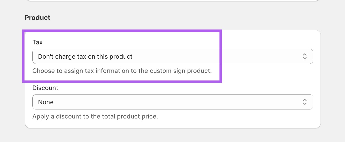 - Scroll down to the “Product” section. Under the “Tax” option, select “Don’t charge tax on this product”. This will ensure that VAT is not applied to the selected custom sign products.