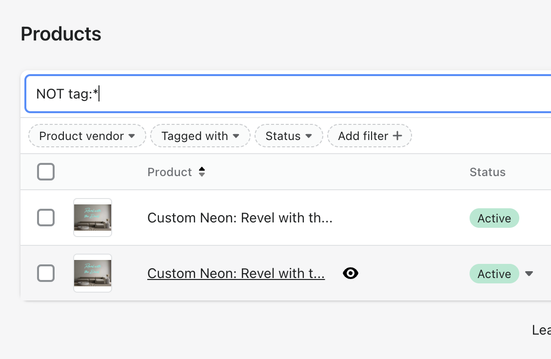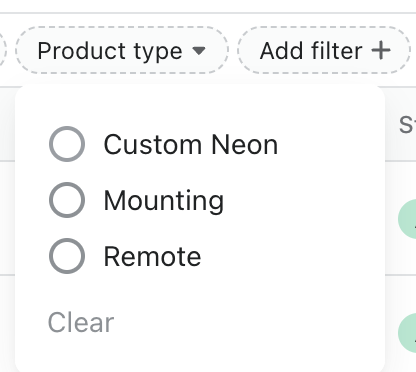 Click on the add filter + button and select Product Type, make sure you select “Custom Neon”.