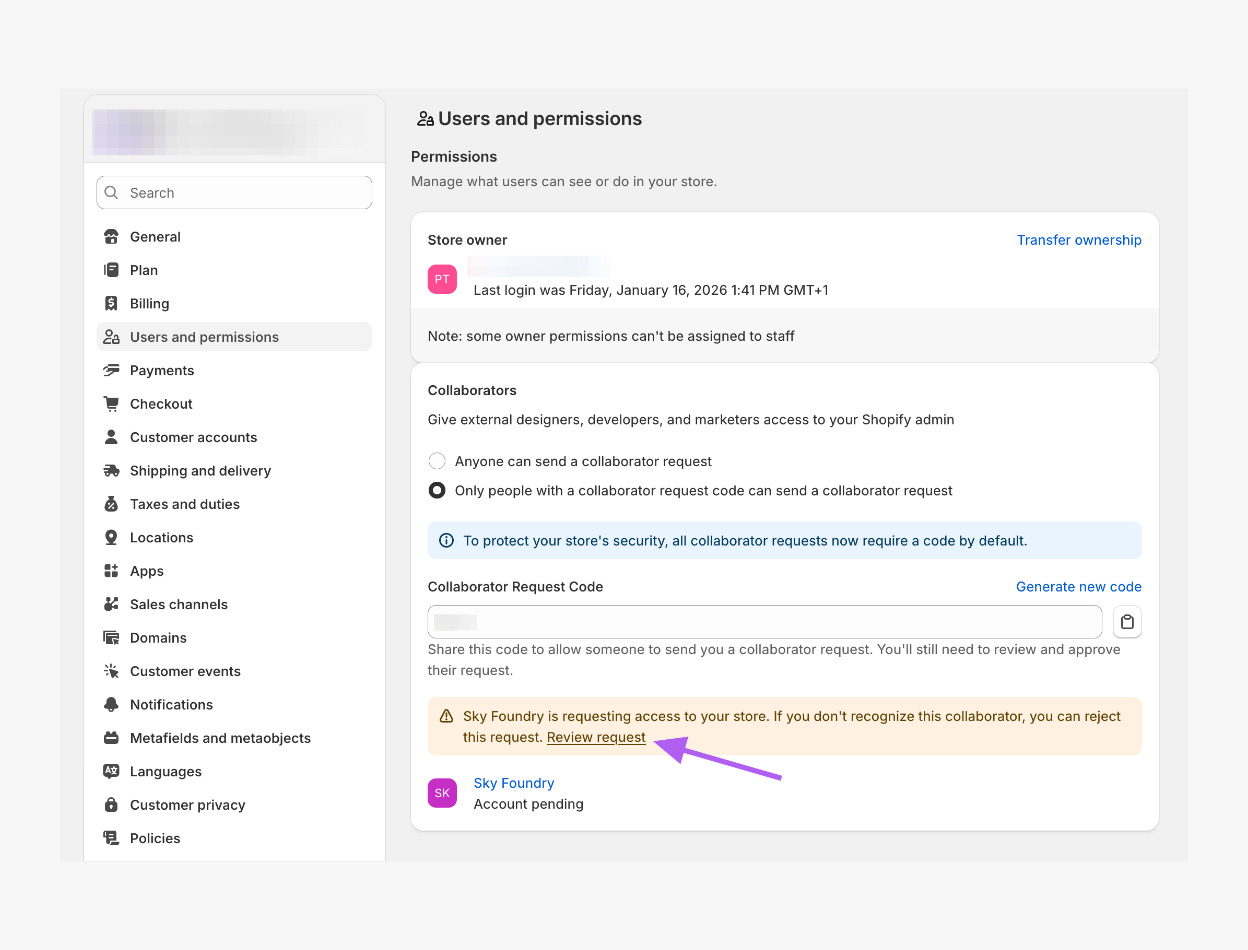 Use the search bar to search for Users and Permissions, or navigate to Settings > Users and Permissions. You can also access the request directly from the email sent by Shopify, which will include our company name, Sky Foundry.