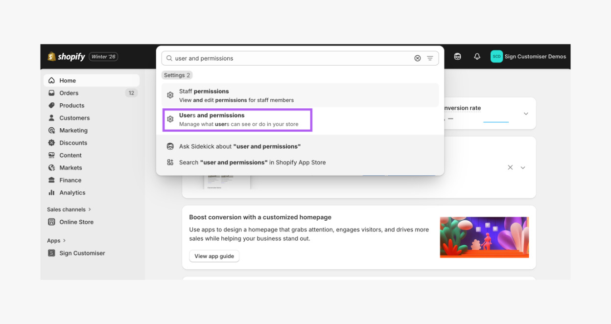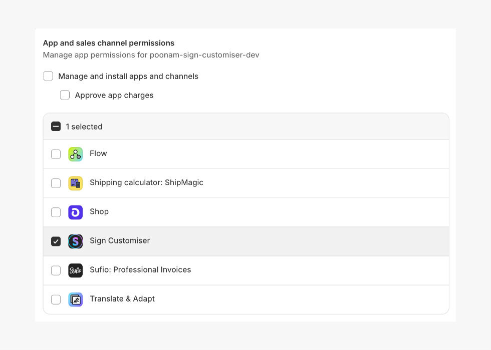 In the App and sales channel permissions section, make sure the Sign Customiser app is checked. If your issue involves another app, make sure it is enabled as well.